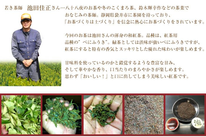他の画像を見る リーフ茶葉タイプ 静岡県産 べにふうき品種100% 二番茶 甘み豊かで香り高い紅茶 茶葉 べにふうき お茶 池田さんの和紅茶リーフ茶葉80g 2袋セット アイスティー 無糖 水出し 水出し紅茶 ストレートティー 国産 販売価格 ¥ 2,400 税込 カートに入れる