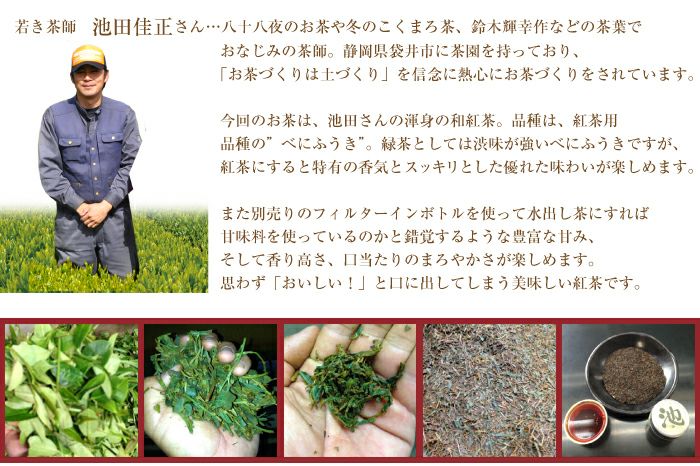 他の画像を見る リーフ茶葉タイプ 静岡県産 べにふうき品種100% 二番茶 甘み豊かで香り高い紅茶 茶葉 べにふうき お茶 池田さんの和紅茶リーフ茶葉80g 2袋セット アイスティー 無糖 水出し 水出し紅茶 ストレートティー 国産 販売価格 ¥ 2,400 税込 カートに入れる